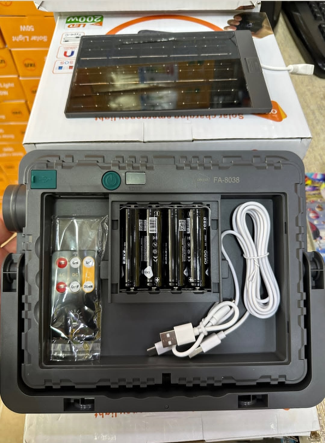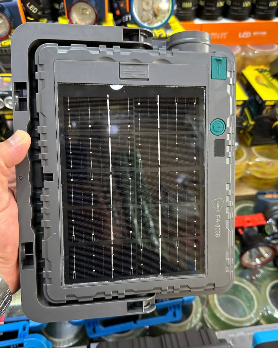 پروژکتور شارژی OKGO مدل FA-8038 یک وسیله با چند کارایی بسیار جالب است. پروژکتور دارای ابعاد 21*26*4.5 ساتی متر و وزن 1200 گرم می باشد. جنس بدنه پروژکتور از پلاستیک فشرده و بسیار مقاوم در برابر ضربه می باشد. پروژکتور شارژی OKGO مدل FA-8038 از 211 لامپ SMD تشکیل شده است که این لامپ ها ترکیب سفید و زرد می باشد و بسته به حالت نوردهی تغییر میکنن جدا ازین دارای حالت چشمک زن یا همان SOS است که بهترین گزینه برای مواقع اضطراری و خطر است. جدا ازین لامپها، پروژکتور دارای یک چراغ قوه در بغل می باشد که می تواند نور مورد نیاز کاربر را تا بیش از 8 ساعت نیز تامین کند. پروژکتور شارژی OKGO مدل FA-8038 دارای صفحه سولار در پشت، دسته نگهدارنده که می توان به عنوان رومیزی نیز استفاده نمود، همچنین دارای جای پیچ برای وصل شدن پایه می اشد. پروژکتورOKGO مدل FA-8038 دارای ویژگی های دیگری هم همچون: مگنت بسیار قوی جهت نصب، دو خروجی سوزنی برای وصل شدن لامپ و خروجی یو اس بی که می توان به عنوان پاور بانک از آن استفاده نمود، دارای 4 عدد باتری 18650 نیزمی باشد که با هر بار شار می توان بین 2 تا 6 ساعت بسته به حالت نوردهی از آن استفاده نمود، همچنین دارای ریموت با قابلیت کنترل از فاصله 8 متری را نیز دارد