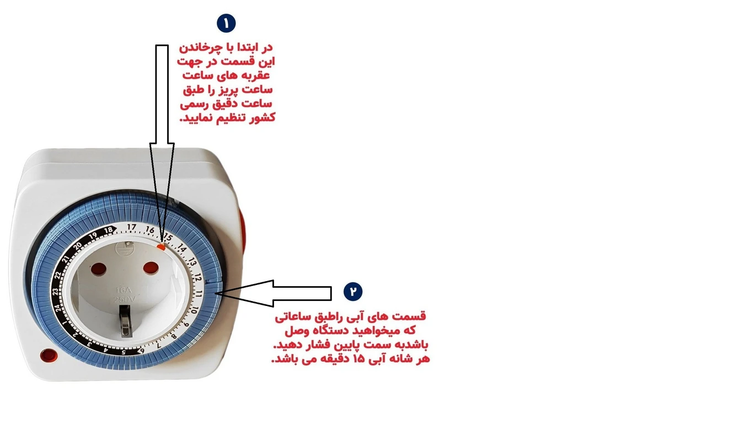 تایمر 24 ساعته پریزی پارس اروند ساخت کشور ایران میباشد. این تایمر قطع و وصل خودکار برق در واقع یک دستگاه زمانسنج است که میتواند در ساعات و دقیقههای مشخص که شما تعیین میکنید جریان برق را قطع یا وصل کند. به سخن دیگر این دستگاه را شاید بتوان یک پریز برق تایمردار نامید. محصول فوق برای مصارف مختلفی طراحی و ساخته شده که برخی از آنها عبارتند از: لوازم برقی داخل آشپزخانه، آکواریوم ، پکیج ، پمپهای آب ، تابلوی مغازه، مودم اینترنت و سایر مصارفی که نیاز به کنترل تحت زمان خاصی دارند. با استفاده از این محصول شما می توانید مویایل خود را با خیال راحت هنگام خواب به شارژ بزنید و بر اساس زمان دلخواه آن را تنظیم نمایید تا شارژ شود. روش تنظیم تایمر به این صورت است که : ابتدا حلقه ی پین های تایمر را به سمت عقربه های ساعت بچرخانید تا فلش قرمز رنگ روی زمان فعلی ، دقیق تنظیم شود سپس تایمر را به برق وصل کنید، هر کدام از پین های آبی رنگ 15 دقیقه میباشد که میتوانید با فشار دادن به سمت پایین ، تنظیم کنید که تایمر در این 15 دقیقه خروجی بدهد.