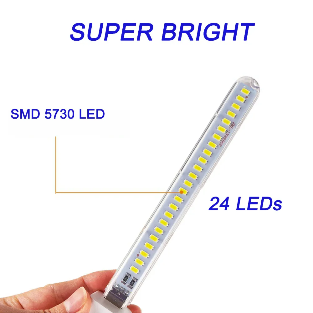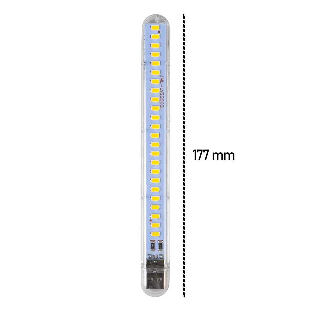 چراغ USB LED کمپینگ 24LED در یک طرف دارای کانکتور یو اس بی است. این محصول نوعی چراغ قوه است که برق آن از طریق درگاه یو اس بی تامین میشود. این لامپ usb را میتوان به پاور بانک، لپتاپ، و وسایلی که دارای خروجی یو اس بی هستند نیز متصل کرد تا بتوان از نور آن بهره برد.این چراغ بهترین گزینه برای استفاده در لپتاپهایی است که کیبورد آنها نور پس زمینه ندارد و همچنین در مواقع ضرورت نیز بسیار پر کاربرد میباشد. این چراغ USB با 24 لامپ LED روشن و کارآمد دارای دانه های نور است که مصرف برق 12 وات است و هر لامپ دارای طراحی موازی است. این ماژول با یک پوشش شفاف برای محافظت از مهره های لامپ و برد مدار طراحی شده است. از ویژگی های این چراغ حمل آسان ، چراغ های کوچک USB بسیار خلاقانه میتوان نام برد. جنس این محصول از مواد PC شفاف است و در دمای بالا و در برابر ضربه ، مقاوم است و شما نگران ایمنی این چراغ نباشید