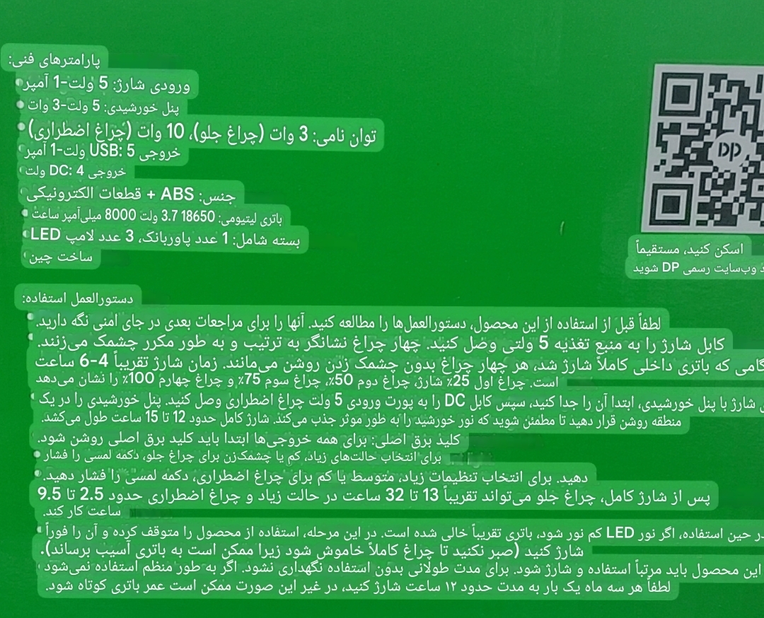 مشخصات کلی برند: DP مدل: DP-7719 نوع محصول: چراغ اضطراری نوع باتری: لیتیوم یون (18650) قابل شارژ ظرفیت باتری: 8000 میلیآمپر ساعت (mAh) مدت زمان شارژدهی: تا 32 ساعت (بسته به حالت نور) جنس بدنه: پلاستیک مقاوم ABS با طراحی قابل حمل حالت های نور: چراغ اصلی ( قوی، متوسط، ضعیف ) و چراغ جانبی ( قوی، ضعیف و چشمک زن) رنگ نور: مهتابی اقلام همراه: لامپهای LED با کابل، کابل شارژ USB کشور سازنده: چین