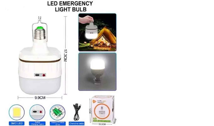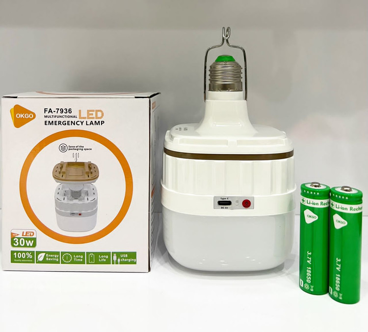 لامپ شارژی چند حالته OKGO مدل FA-7936 دارای جنس بدنه پلاستیک نشکن همچنین، مقاوم در برابر ضربه می باشد. دارای سه حالت نوردهی می باشد. قدرت چراغ چادری چند حالته ، 30 وات و دارای طول عمر بیش از 50000 ساعت است. لامپ شارژی چند حالته هم با دوعدد باتری با سایز 18650 وهم با 3 عدد باتری قلمی قابل روشن شدن می باشد. چراغ چادرچند حالته OKGO مدل FA-7936 دارای سرپیچ سقفی می باشد که می توانید براحتی وصل کنید و جدا ازین دارای حلقه نگهدارنده نیز می باشد که این حلقه مناسب برای سقف چادر در کمپ است. منبع تغذیه لامپ شارژی چند حالته توسط کابل تایپ سی است